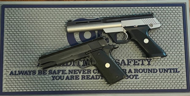 Last is a picture of the 22 Target pistol with its contemporary, the Combat target. Both made the same year and bought by Brady. I am now the owner of the Combat Target 1911 thanks to Brady.