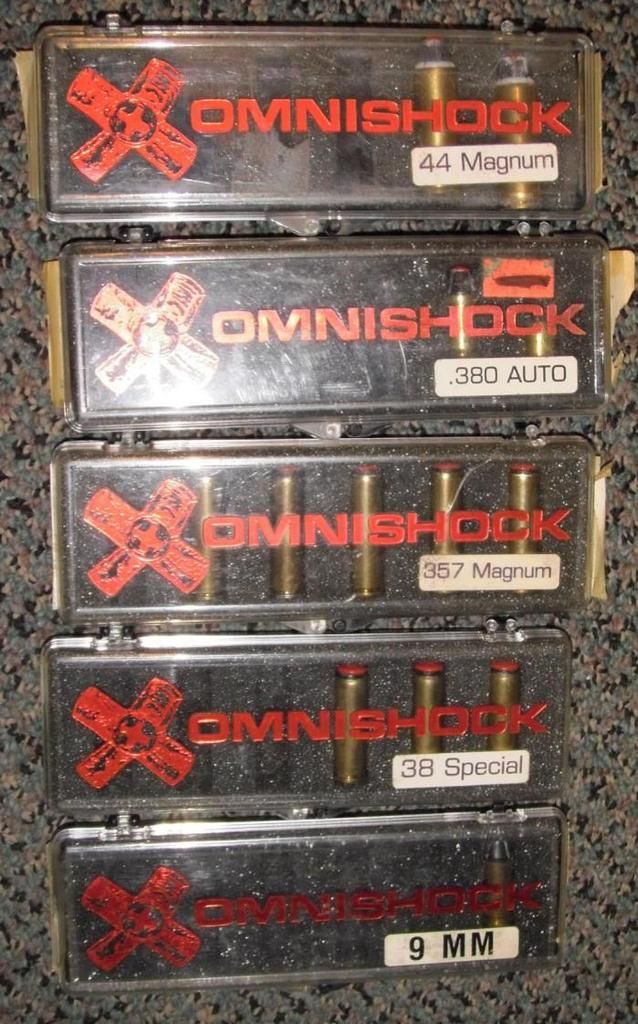 J&S Screw Company produced the slotless screws and powder coated them red. The initial screws were steel, but this fell afoul of Federal armor-piercing projectile legislation. After the BATF ruled the Omni Shock as armor-piercing, Omni Shock switched to a 7071 T6 aluminum slotless screw. Unlike Ultra Shock, Omni Shock machine formed most of its own projectiles. The sole exception was the .22 Long Rifle load, which was formed from factory CCI Stingers.