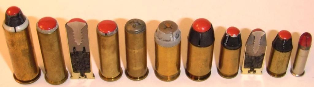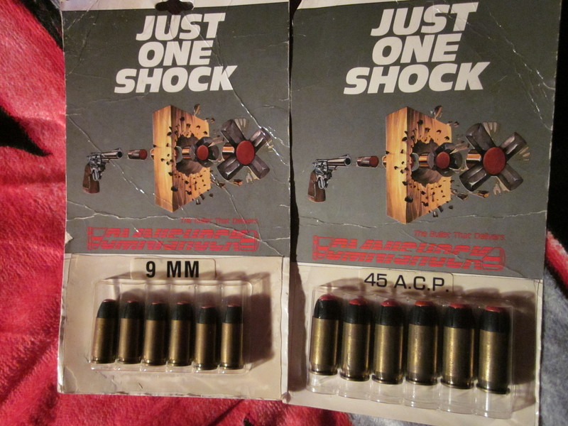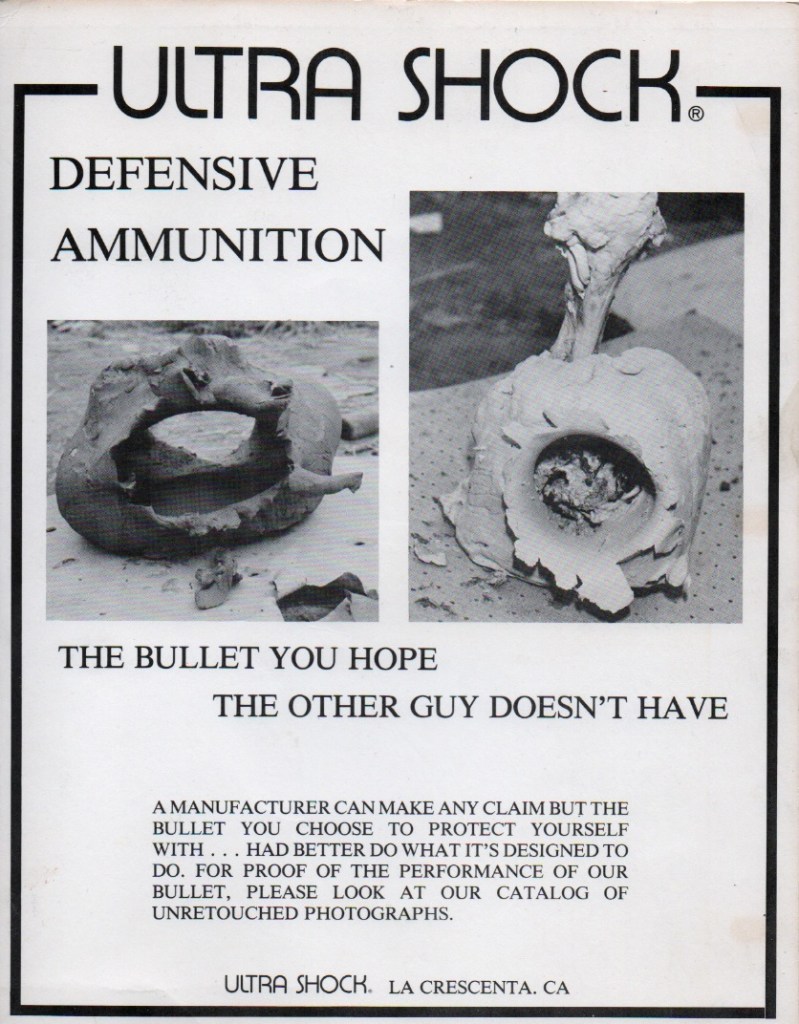 The first to appear was the “Ultra Shock”, designed by Alex Goodrich. It was meant to give hard cover penetration, while also offering expansion in soft tissue. These were marketed starting around 1982 or 1983 at Southern California gun shows and with some local gun shops. The cartridges were available in .357 Magnum and .38 Special, with the latter offered in both standard pressure and +P loadings.