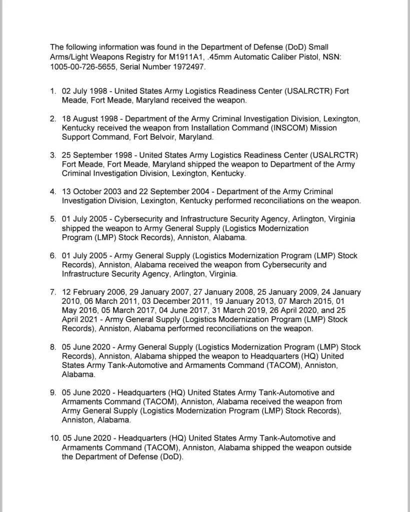 Being curious about the service history of the pistol, I submitted a FOIA request. The FOIA response received was very disappointing and very generic.