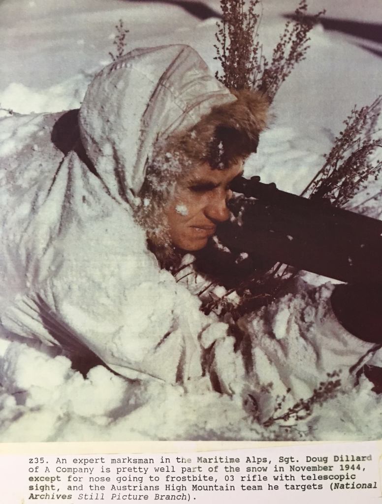 I based the lay out mostly on the series of photos below of Doug Dillard. I tried to find the quote but apparently even though they are great photos they were littler more than a photo op. Doug said something to the effect of they handed him the sniper rifle and had him plop into the snow for a few photos. Never the saw the M1903A4 before or after that little photo shoot.