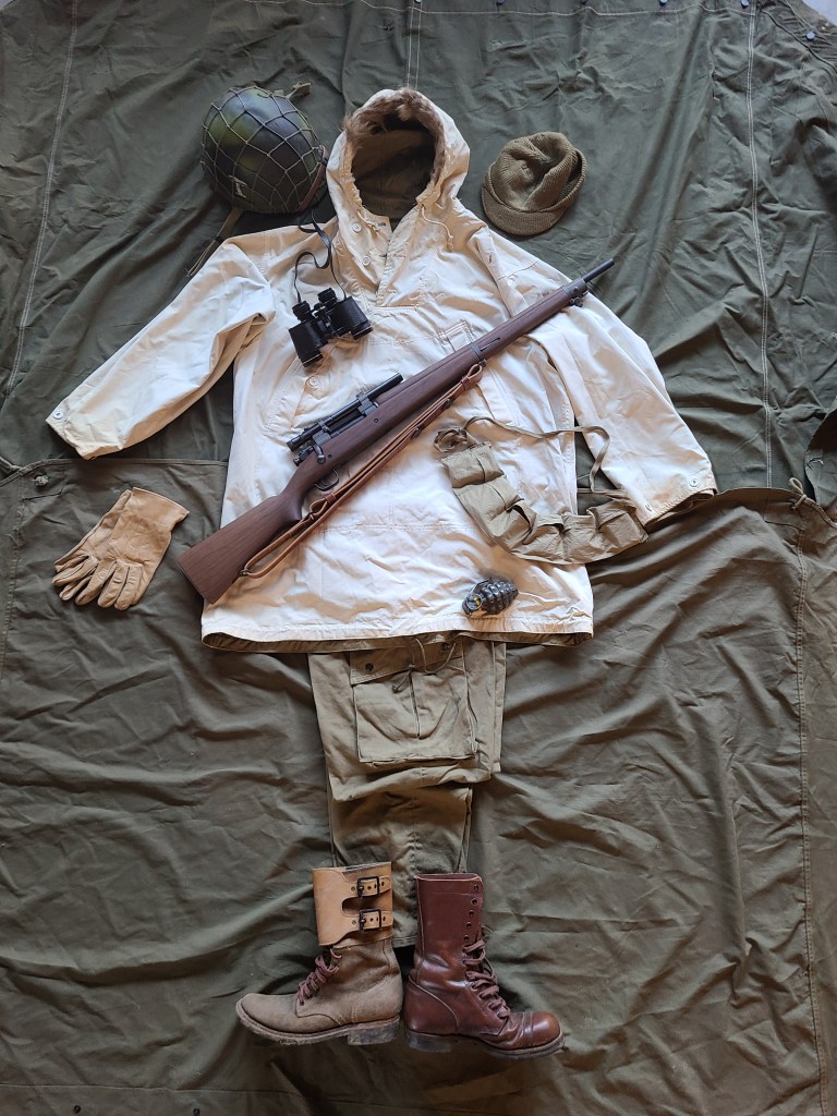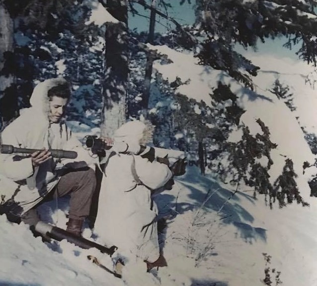Equipment wise it was mostly very light, as the work was patrolling and in rough terrain on top of that. From the few pictures I’ve fount it appears that web gear was often discarded in lieu of just bandoliers and pockets. Being in the mountains the troopers were issued the Reversible Ski parka. There is a mix of first and second pattern in photos (although there was never a definitive delineation between variants). The remaining gear is fairly standard. The pants were either regular M1937 wool trousers or their M1942 paratrooper pants (by now most of the camouflage paint would have worn off). Boots were either the Jump boots or Combat Service (double buckle) Boots. Shoepacs are seen as well.