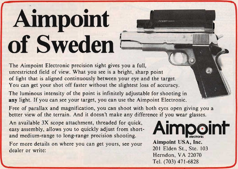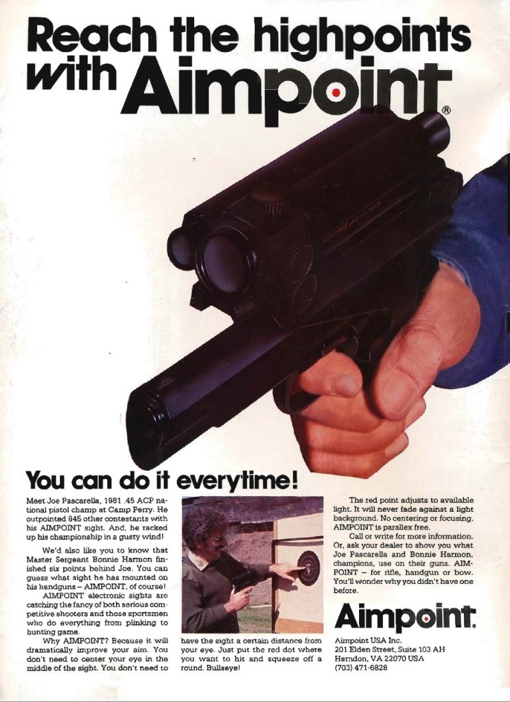 The first major success came in 1980 when Joe Pascarella used red-dot optics to win the 2700 Aggregate at the NRA National Pistol Championships at Camp Perry. Pascarella followed up in 1981 by winning the 2700 Aggregate again with the Aimpoint Mark II.
