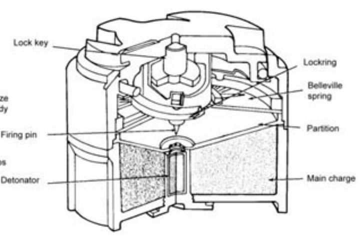 M14 Anti-personal Mine “Toe popper”. The M14 mine is a US small anti-personnel landmine first fielded in the late 1950s. The M14 mechanism uses a belleville spring to flip a firing pin downwards into a stab detonator when pressure is applied. Once deployed, the M14 is very difficult to detect due to its mainly plastic design. Because of this the design was later modified to ease mine clearance via the addition of a steel washer, glued onto the base of the mine.In order to activate the M14, the base plug is removed and discarded and a stab detonator is screwed into the base of the mine. Then the mine is placed into a shallow hole in the ground and the pressure plate is carefully rotated from its safety position to the armed position using the special arming spanner supplied in each crate of mines. Finally, the U-shaped safety clip is removed from the pressure plate and discarded. At this point, the mine is fully armed.The top of an M14 has a simple arming indicator (a yellow-painted arrow) on it which can point to either A(rmed) or S(afe), giving a clear indication of its status. When the arrow points to ‘A’, the M14 will detonate if stepped on. Disarming the M14 requires the arming steps to be performed in reverse. However, due to the possibility of a booby trap or some other type of anti-handling device being fitted underneath, it is often standard demining practice to destroy landmines in situ, without attempting to remove and disarm them.