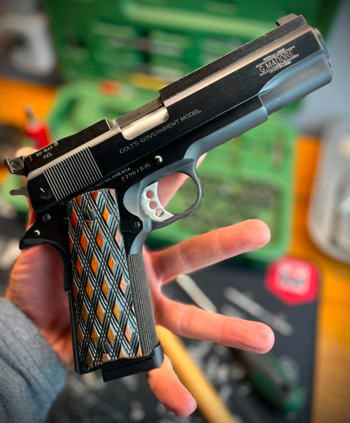 From 1911_purview Colt 70 series 1911 in .45 ACP by legendary Bullseye pistolsmith George Madore out of Brookhaven PA. George famously recited the mantra “test don’t guess” so his guns were renown for flawless function and supreme accuracy. This beautiful example shod in D45 “skip line” grips by Steve Herrett.