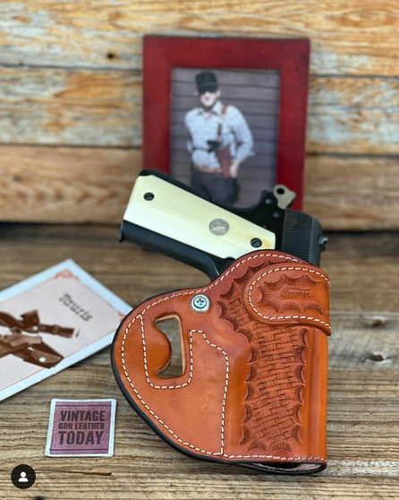 We always have a large selection of his work on our site. Recently Mike has agreed to provide us with some custom hand basket stamped leather lined holsters. Here is one for a Colt Commander. These new holsters are as good as gunleather gets..