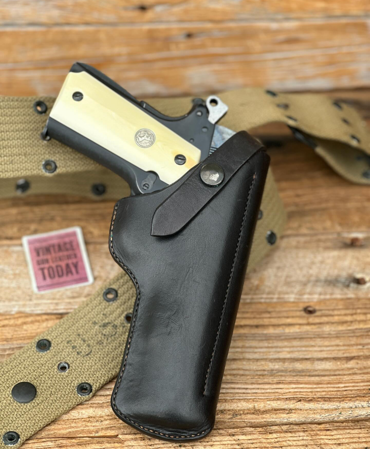 Berns Martin Calhoun City, Raider Holster for the Colt 45 1911 5” Government model. Sewn sight track, retention strap that can be used or snapped to the rear and military type brass wire belt hanger. I can say I’ve never laid my hands on one or even seen one other than in a print ad until this came in from a collector. Very rare holster which is available on the site..👇🏻 👉🏻 Vintagegunleathertoday.com