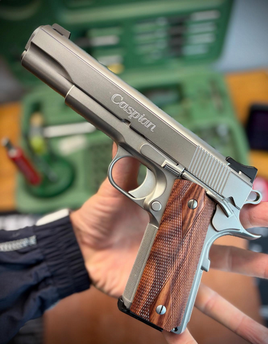 Stainless steel Caspian in .45 ACP by Nebraska pistolsmith Dave Erickson. His shop in Omaha was known as Condition One. This gun features Heinie sights, hard fit KKM barrel, 30 LPI checkering, Chen MSH, beveled magwell, serrated arrow pattern top, full dehorn — it’s just flat out one of the slickest 1911s ever made. Dave still lives in Bennington Nebraska and works for the Army Corps of Engineers. This gun now feels “complete” since procurement of hand checkered grips by Mr. Craig Spegel.