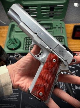 in .45 ACP by professional shooter and gunsmith Tim Bacus. One thing that I have come to know is that when professional shooters morph into gunsmiths (Dettlehauser, Salyer, Eddie Garcia) they purpose-build guns into exacting instruments–not bespoke Colt treasures. So while Caspians may be ugly, they are straight, bulletproof, and easily made into pew pew scalpels. This gun is an absolute laser with hard fit Nowlin barrel snugged up with a Maryland Gun Works bushing, Bomar adjustable rear sight, flawless machine work, and surgical slide to frame fit. Shooters make guns that run flawlessly, because if you can’t finish, you can’t win. If you ever find a gun made by Big Timmy, buy it. You’re welcome. Blood orange Padauk grips by my man Jon Aho