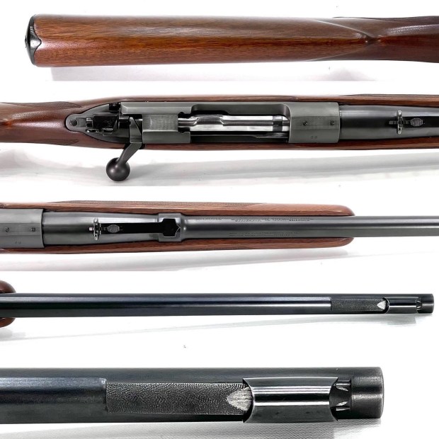 “This 1936 rifle, Model 70 serial number 86, came to us as a poorly executed custom, with 6 non-factory holes in the receiver, and rust pitting so deep the serial number was almost unreadable. It took over 2 years and a number of specialists to fully restore the receiver, which we’ve now pieced back together with correct pre-war factory barrel and stock . It’s as close to perfect as you’ll ever find. No one will ever know it was a complete dumpster fire when it first arrived!“