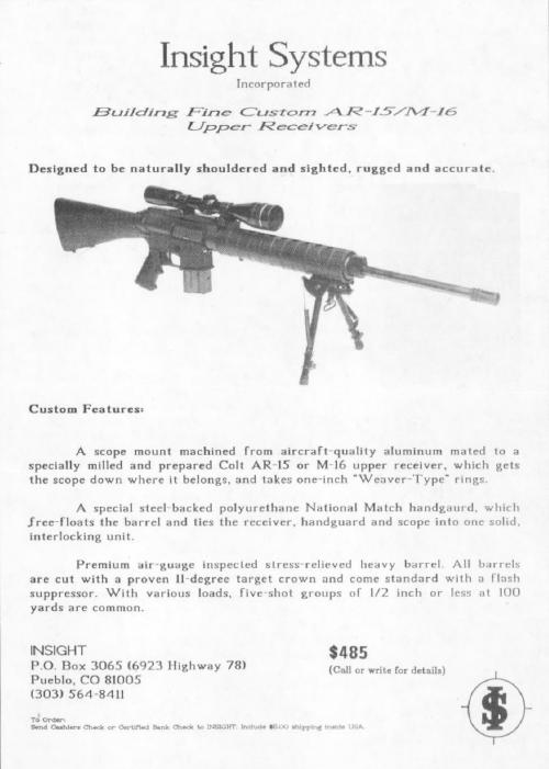 Interest in the Service Rifle category was renewed with the US Marine Corps’ adoption of the M16A2. While not specifically designed for match use, it obviously possessed more match-friendly features than the legacy M16A1. Gunsmith Bill Wylde reportedly developed his alternative to the 5.56mm NATO chamber in 1984. Another early civilian innovator was Kim Neubert, credited with one of the first “Service Rifle”-legal free-float tube designs that still allowed for the installation of the standard GI handguards. Lee Mosher of Insight Shooting Systems, Inc. initially only wanted to make an accurate varmint rifle out of the AR-15. However, his customers quickly picked up on the utility of his optic-ready, match-grade AR-15 conversions.