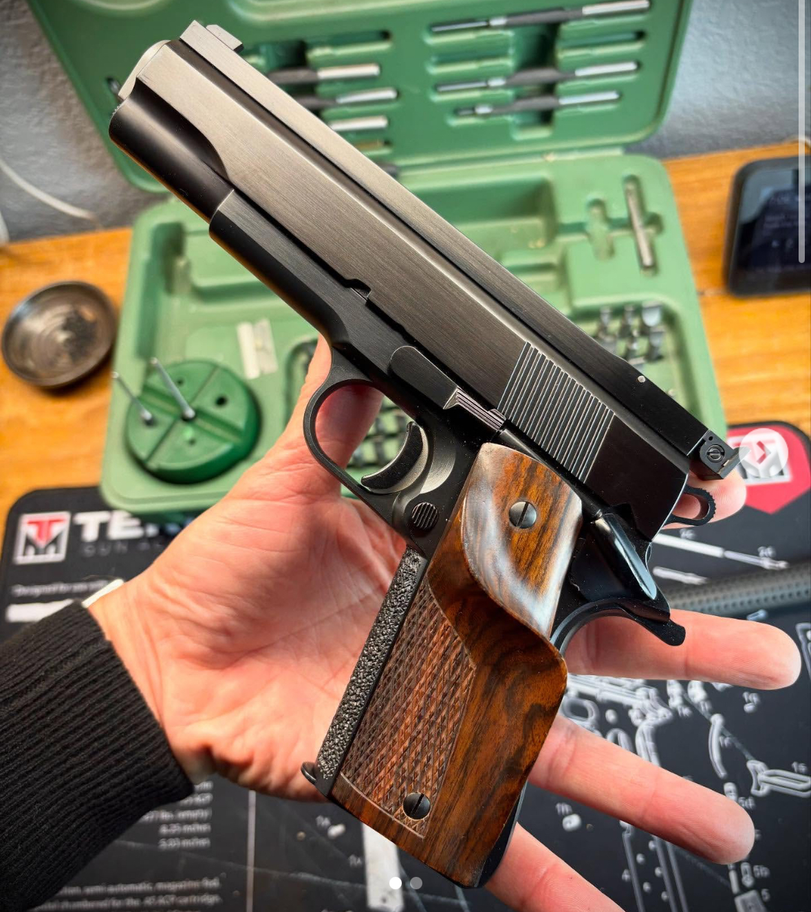 Les Baer lower with Colt AMU slide by Jack Maple. Big Jack (as his friends called him) was born September 3, 1930 in Little Rock Arkansas. At 17 he enlisted in the US Army, and immediately after basic training, he embarked upon his first overseas tour in Germany. He quickly rose to rank of sergeant and became a tank commander with the famed “Big Red One” infantry division. In 1956 when President Eisenhower established the United States Army Marksmanship Unit, Jack earned a spot as one of the first members of the Marksmanship pistol team. From there his great mechanical abilities led him to gunsmithing and eventually to be referred to as “the greatest gunsmith in the world”. In 1994, he was inducted into the US Army Marksmanship Hall of Fame. He led a very distinguished 20 year career as an enlisted man, and another 18 years of civil service with the Marksmanship Unit. Of course the goddam thing runs —Bullseye guns forever. OG orthopedic grips refinished by yours truly —getting better. No slant grooves were harmed in the making of this gun.