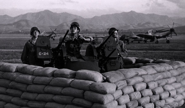 How do you increase the firepower of your magnificent .50 cal. M2 Browning Machine Gun when there’s only room for one finger on the trigger and someone else has to feed you the belt so it doesn’t get kinked up? You climb out of your foxhole, take it off the tripod, mount it on a carriage, and stack up four of them, ready to go. Thus you have the M55 Quadmount.