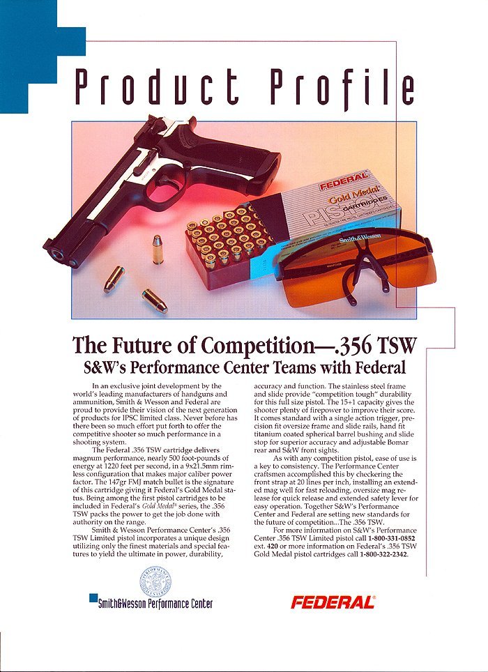 “The .356 TS&W pistol produced by the Smith & Wesson Performance Center has been on the market for more than a year and many more than the 1000 units have been sold. Ammunition manufacturers producing the ammunition or planning to produce it include Federal, Cor-Bon, and CP Bullets. Only Federal ammunition is “generally available” at this writing. The pistol may be used in Limited, but only at minor power. The good news is that the sample Federal ammunition easily made major (178.5 power factor at 4200 ft elevation) and as soon as two more commercial manufacturers come on line, the pistol will be completely legal at major power factor.”