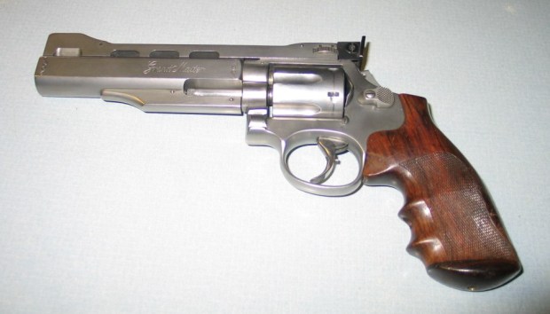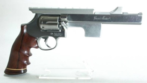 The stainless revolver is a late-1980s (or later) “Grand Master Universal” conversion in .44 Magnum. An updated version of the “Grand Master Deluxe,” the Universal was meant for suitability for Action Shooting, PPC, and hunting. The muzzle brake on the Universal could be screwed off and replaced by a plain muzzle cap if circumstances (e.g.: competition rules) required it. The revolver is equipped with a Wichita rib with Power’s four-position, dial-selectable rear sight.