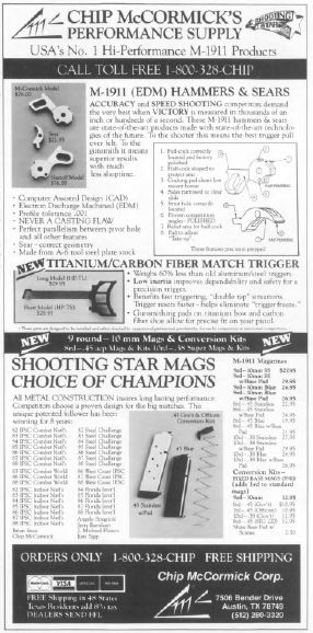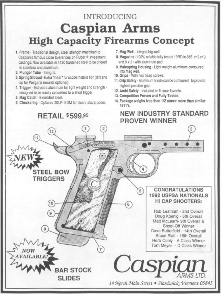 The CMC frame kit’s first USPSA Open Nationals win was in 1992. Jerry Barnhart’s racegun was built by Wilson Combat. Matt McLearn used a Caspian widebody frame to win the 1993 USPSA Nationals and IPSC World Shoot.
