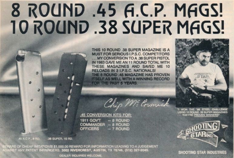 From around 1980 to 1993, IPSC and USPSA only allowed flush flt magazines for the M1911. While solid bumper pads were kosher, you could not use an an extended tube or a hollow baseplate to expand the capacity of the pistol. So the only way to increase your magazine capacity in the single-stack M1911 was to either use a Devel (pre-Shooting Star) follower and/or swap to a smaller caliber.