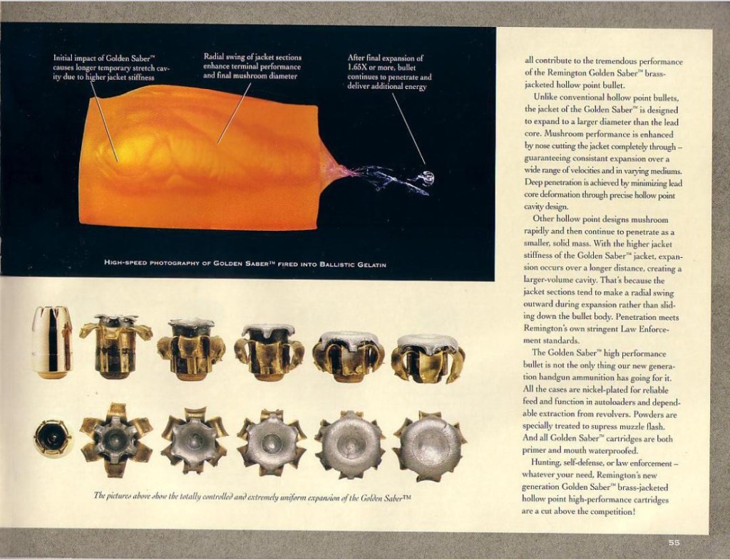 At some point, Remington lured away Black Talon co-creator David K. Schluckebier from Olin-Winchester. Schluckebier teamed with Joseph W. Jakonczuk to create a new hollowpoint bullet using cartridge brass as the jacket. The new Golden Saber was unveiled at the 1993 Shot Show. Oddly, Remington had yet to file the patent for it yet. Schluckebier and Jakonczuk filed their application in August 1993, and received US Patent #5,357,866 in October 1994.
