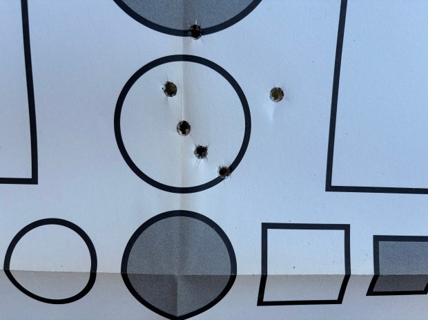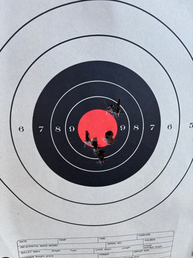 My first 6 shots of the good ammo was off the bench and bags at 25 yards. I have to say the new glasses really got me back to normal and I think this is pretty good. I am not a 6 gunner. Maybe the world’s worst revolver shooter even. God made these hands for the M1911. But I am pleased with that group. As is normal fort me shooting a revolver, the groups are never at point of aim no matter how I shift my grip or change trigger finger positioning. I have no idea. I give up caring at this point. As long as I shoot a group some where on the target that works for me.