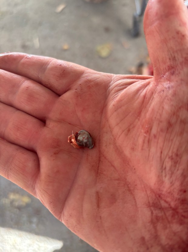 You can see the opposite side entry hole and the closest hole is the exit. Oddly enough while skinning it I did not expect to see an exit hole. None was visible. I assumed the bullet had come to rest some where in the chest cavity. Nope. It was just under the hide.