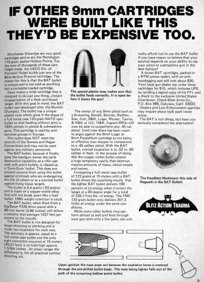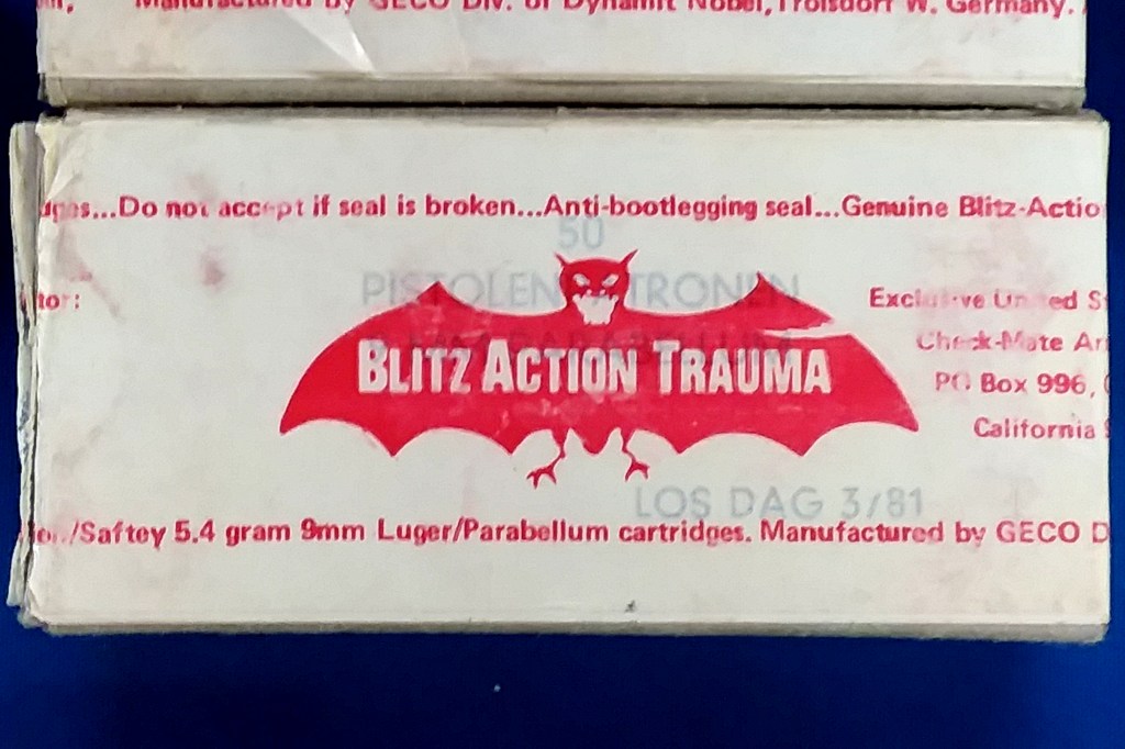 Some of you may remember the old “Blitz Action Trauma” or BAT. Geco had nothing to do with the BAT marketing campaign. That was solely the work of the US importer Phil Engeldrum. The BAT label was pasted over the standard Action Safety box, and served as a box seal. The label was thin enough that you could see the standard Geco markings under it. For a time, he even imported the .357 Magnum vaiant.