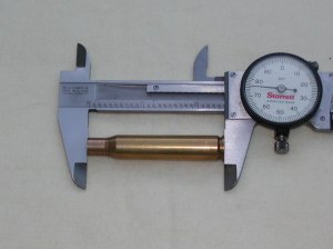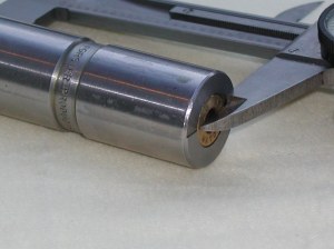 The photo shows the use of the caliper on the case gauge. The measurement must be taken before and after resizing because it is the difference in those two conditions that we are interested in determining. As noted before, the primer must be removed and the base examined for burrs prior to taking these measurements.
