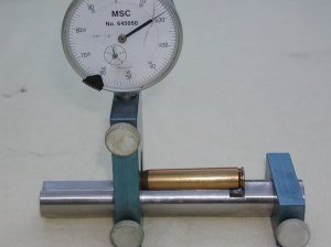 Concentricity checking is really more a measure of your reloading die’s performance than of the case itself, but the quality of the case will influence concentricity as will some case operations such as neck turning. There’s no great mystery here; set up the tool to read on the case neck about 0.125″ in from the mouth, make sure everything is clean and go slowly. Any operation with a dial indicator is meant to show the reading at various points, not to read in a continuous sweep of the piece.