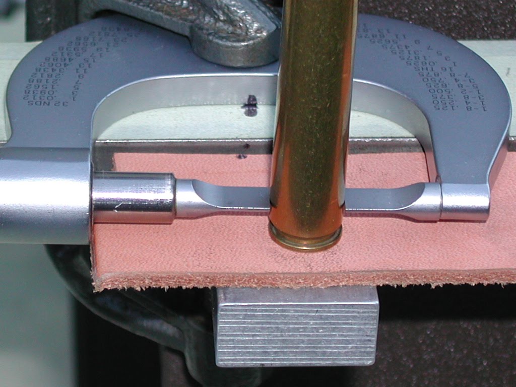 As with the case base measurement, it is important to create a method that allows you to consistently measure the same spot on the case neck. The case neck tapers from mouth to base, so if you aren’t measuring the neck at the same place along its length each time, you aren’t getting useful results. You can see in the photos that I’ve made a small step on the micrometer for the case to rest on. This allows me to read the same place each time. If you look carefully at the picture of the leather vise jaw pad used in the case base measurement, you’ll see where our little step came from. Be resourceful!