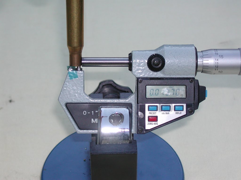 When measuring base diameter, it is the change from one condition to another (unsized vs. sized, or fired with load A vs. fired with load B) that interests us. The micrometer gives us resolution below 0.001″, in fact, depending on the micrometer, you may be a couple of decimal points beyond that – but that doesn’t mean you should believe the numbers! A micrometer, especially a modern digital version has the ability to resolve to an incredibly small degree, however, the accuracy of those numbers is dependent on very skilled and refined technique on the thimble as well as temperature, material and other factors. For our purposes (ham-handed reloaders measuring soft brass at varying temperatures), any two measurements taken with care and within 0.0003″ (three tenths) of each other, should be considered to be the same. If your micrometer reads below tenths, cover that last digit with tape, it’ll just distract you!