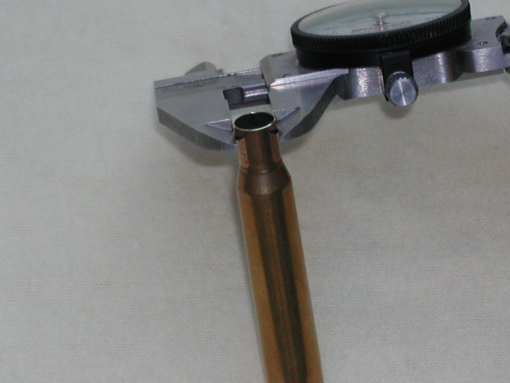 The caliper is a useful instrument for measuring case neck diameter; its resolution level being sufficient for this purpose. The main caution is to avoid the very end of the neck (the case mouth) as it can have slight irregularities. The picture shows a good location, just a bit back from the case mouth but still towards the front of the neck. Use the narrow part of the caliper jaws for this measurement to avoid undue influence from the slight taper in the case neck.