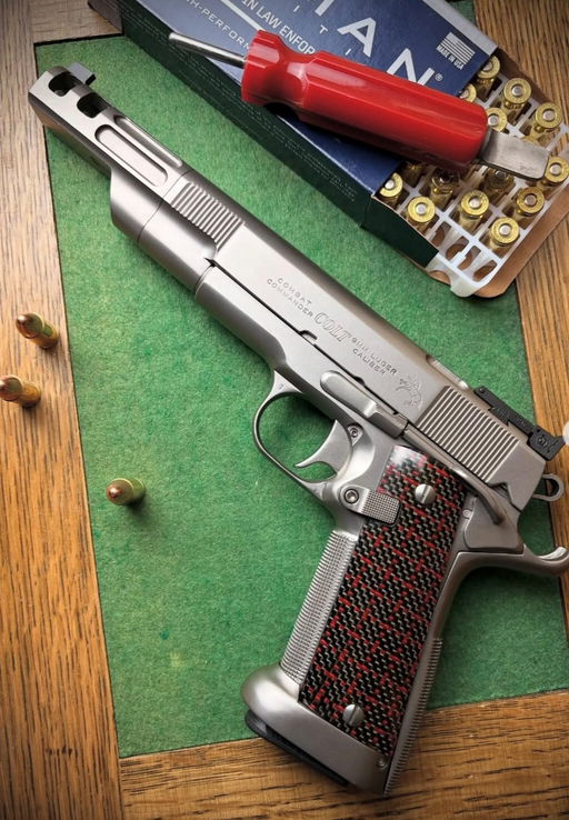 Colt commander in 9mm by legendary pistolsmith Otto Matyska, who operates out of his Affton MO shop called Otto Comp. Right around the time I was born, Otto immigrated to the U.S. after narrowly escaping Czechoslovakia during the 1968 communist invasion. For the last 40 years he has been masterfully crafting one of a kind 1911s like this, largely for competitive shooters. Now, stop power scrolling for one minute and really look at this gun. Since Jim Boland is dead, and Ned Christiansen’s books are closed, who else on planet earth could make something like this? The answer is nobody. And even if they could, they likely wouldn’t because of the time and cost that would be associated with this radical build. Why did he start with a commander? The answer is speed. Sports car engineers will tell you lighter things go faster. Right @georgehuening? Lighter slide, faster cycling. Next, he lightened (read hollowed out) virtually everything inside and outside of the gun. After that he built a GARGANTUAN compensator for this would be race machine, because his shop is called Otto Comp. How does it shoot? It’s like shooting BBs out of a Civil War canon. The pivoting trigger fosters a very crisp sub 2.5 pound pull, so you better believe there were a few negligent discharges the first time I shot it. Now look at the back of the gun. He machined out the entire back of the frame and then installed a Novak-like fixed grip safety. That alone likely took two days to make. The masterful dehorning, the hand made magwell, the checkering, the custom beavertail, the YUGE comp, a 5 1/2 inch match grade Wilson pipe, and an adjustable Bomar, all cloaked in nickel/NP3 and shod in carbon fiber grips, make this thing (to me) a virtual work of art. As my buddy Tony would say, the thing looks like it’s going fast, just sitting on the counter. This gun was not assembled…it was built, and there’s a difference. Of course today’s background music is of course Immigrant Song