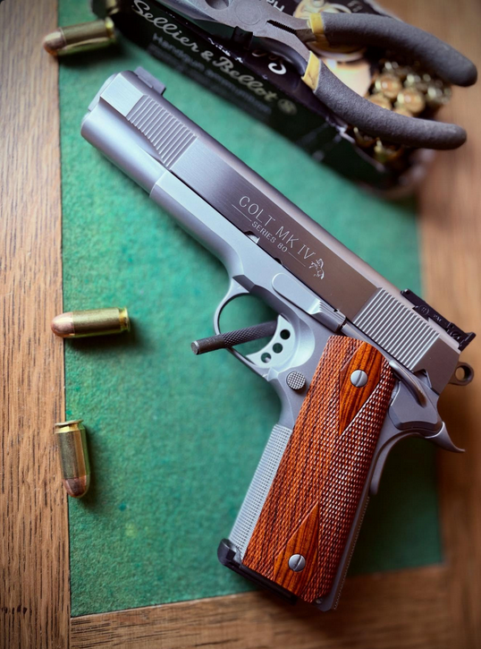 Colt stainless 80 series in .45 ACP by retired police lieutenant, master firearms instructor, and now CEO of TK Customs, Tom Kilhoffer out of Tomasboro Illinois. This 1911 is drum tight (with a low mounted Bomar and match grade Wilson barrel) and it runs like a scalded dog. Ordinarily, 80 series guns don’t deserve (or get) Spegels, but my well runneth deep as of late so why not. Cocobolo DDs by a dude with talent on loan from god.