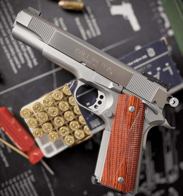 Colt stainless 80 series in .45 ACP by retired police lieutenant, master firearms instructor, and now CEO of TK Customs, Tom Kilhoffer out of Tomasboro Illinois. This 1911 is drum tight (with a low mounted Bomar and match grade Wilson barrel) and it runs like a scalded dog. Ordinarily, 80 series guns don’t deserve (or get) Spegels, but my well runneth deep as of late so why not. Cocobolo DDs by a dude with talent on loan from god.
