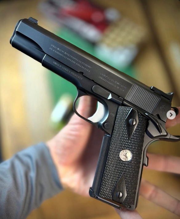 Colt 1911 in .45 ACP by Drake Oldham —cop, firearms instructor, and now retired pistolsmith. This gun (built on a WWII reproduction Colt) is all business. She is built with a Kart barrel, Heinie rear sight, exacting slide to frame fit, and flawless checkering. This pony now shod in ebony DD grips..because black on black is a whole vibe.