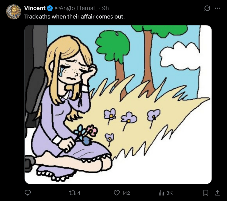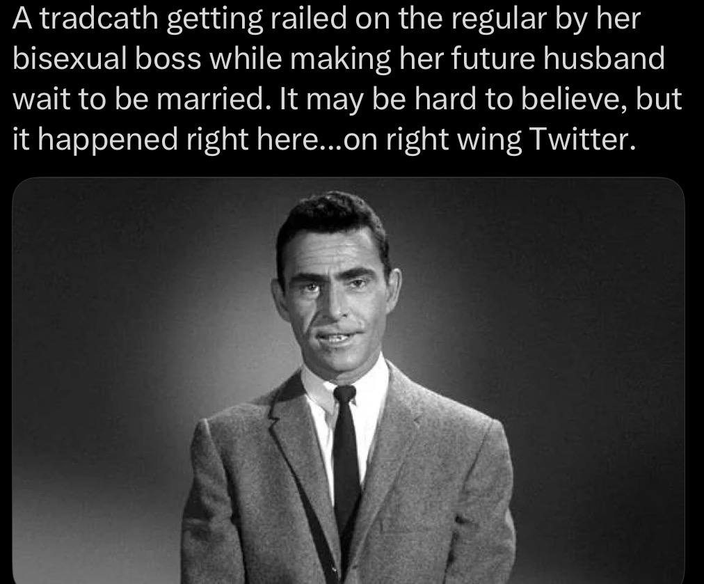 Some of these might need context for some of you. The thumbnail of the married couple with the pope above and you will see some more. The bride had been famously claiming to be a virgin trad catholic conservative commenter and made a nice career out of it over the last year. A couple nights ago it all came out she had been cheating on her fiance ( now husband ) for their entire engagement with her boss and reportedly even aborted a pregnancy by said boss. The boss being a married man with children and himself a right wing podcast/commenter. Yes it is horrible but all we can do is laugh these days.