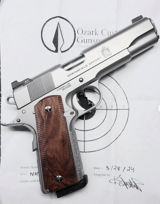 This Mil-Spec Springfield in .45 ACP was built by KJ Phillips out Ozark Custom Guns in Berryville Arkansas. KJ started building guns at Wilson Combat in 2011, moved over to Nighthawk for a spell, and then set out on his own in 2022 creating Ozark Custom Guns. My understanding is that he has moved to Indiana and is now heading up Alchemy Custom Weaponry in the wake of Mr. Schauland’s departure. I have followed his career from a distance, admiring his ornate and highly imaginative modern aesthetic. I’ve never bought one because they aren’t cheap and they never really appealed to my old school desire for Colts with Barstos & Bomars. I know…Boomer, Unc. But I’m glad he’s moving the needle and doing something different–because even kids know from video games that standing still will get you killed. This gun went up for sale on a popular 1911 forum and the cost of admission was almost nothing, so I couldn’t help but buy it. This is kind of KJ’s “budget build” but to me less is more. Way more. I just picked it up from the FFL tonight so I haven’t had a chance to shoot it yet, but I’m pretty impressed by all of it. Beautiful stippling, meticulous dehorning, flawlessly mounted Heinie, surgically fit beavertail, and expertly mated Kart pipe. It has zero rattle and the slide articulates on the frame slicker than chicken grease on monkey bars. I wasted no time getting these Kingwood Spegels on it, that some idiot sold me this week. Hell, they both arrived in the mail today so I figured it’s Kismet that they should go together. So, here it is–the future of custom 1911s, made by a kid who is willing to hang it all out there in an attempt to carry the ball when the old guys cross over the rainbow bridge. Now, is he related to the legendary Ron Phillips? Distantly I think, but I don’t really know