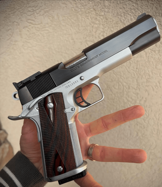 Colt 70 series 1911 in .45 ACP by 2014 APG Pistolsmith of the Year and industry legend Terry Tussey out of Mound House Nevada. Squared and checkered trigger guard, burried Bomar rear sight, Swenson thumb safety, sculpted beaver tail, magwell, two tone with chrome lower, Clark hard fit match grade barrel…this one checks all the boxes for me. Late in his career, Tussey was paralyzed in a bike accident from the waist down, but he still had full use of his arms and hands, so he smithed up until his final days. He died at the age of 80, succumbing to a respiratory infection. He was well liked by everybody in the industry and on my list of gunsmiths who mattered. Oh yea, he made 1911s for actor Steven Seagal….because nobody else would. This one finally found proper grips made by Craig Spegel. You idiots keep selling em…I’ll keep buying em..