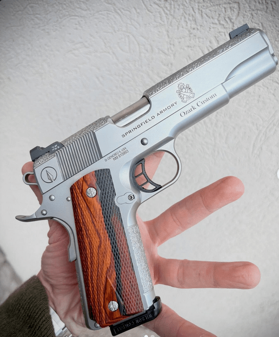This Mil-Spec Springfield in .45 ACP was built by KJ Phillips out Ozark Custom Guns in Berryville Arkansas. KJ started building guns at Wilson Combat in 2011, moved over to Nighthawk for a spell, and then set out on his own in 2022 creating Ozark Custom Guns. My understanding is that he has moved to Indiana and is now heading up Alchemy Custom Weaponry in the wake of Mr. Schauland’s departure. I have followed his career from a distance for years, admiring his ornate and highly imaginative modern aesthetic. I’ve never bought one because they aren’t cheap and they never really appealed to my old school desire for Colts with Barstos & Bomars. I know…Boomer. But I’m glad he’s moving the needle and doing something different–because even kids know from video games that standing still will get you killed. This gun went up for sale on a popular 1911 forum and the cost of admission was almost nothing, so I couldn’t help but buy it. This was kind of KJ’s “budget build” but I am still impressed by all of it–beautiful stippling, meticulous dehorning, flawlessly mounted Heinie, surgically fit beavertail, and expertly plumbed Kart pipe. It has zero rattle and the slide articulates on the frame slicker than chicken grease on monkey bars. I love the unique stippling on his guns, so I called him and asked him if he could do more. He said absolutely, so I dropped it in the mail and 10 days later this 1911 came back with the top, thumb safety, slide stop, magazine release, and even the grip screws stippled. So, here it is–the future of custom 1911s, made by a kid who is willing to hang it all out there in an attempt to carry the ball when the old guys cross over the rainbow bridge. I get asked weekly who I would send a gun to for a custom build. Well, here’s your guy. Now, is KJ related to the legendary Ron Phillips? Distantly