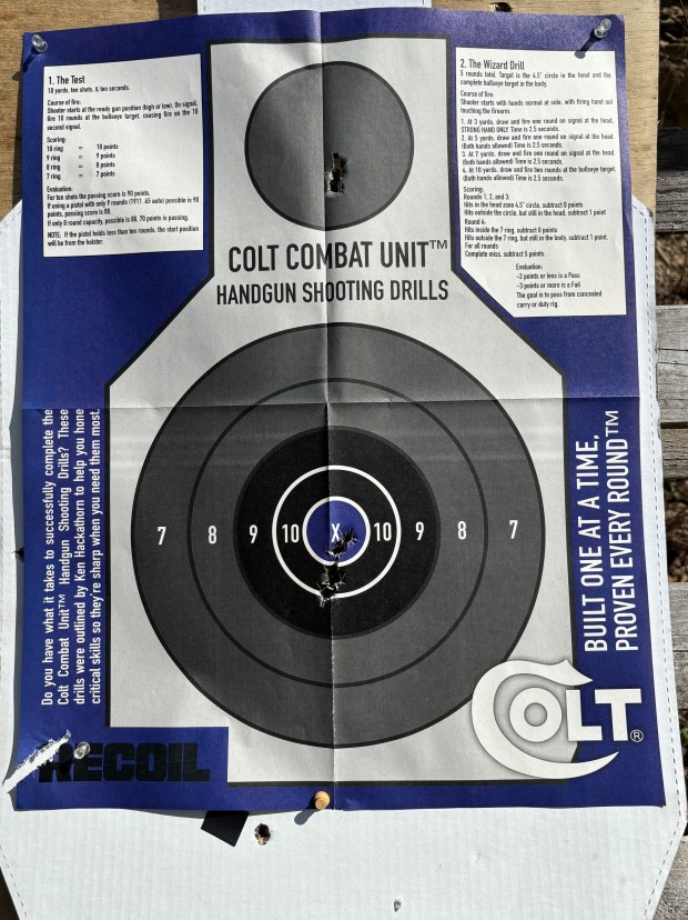 I thought it would be fun to use one of these Colt targets they gave away at the 2016 NRA show for my warm up. I shot this at 7 yards off hand slow fire as a warm up. I fired 5 rounds at the X then 3 at the head area.