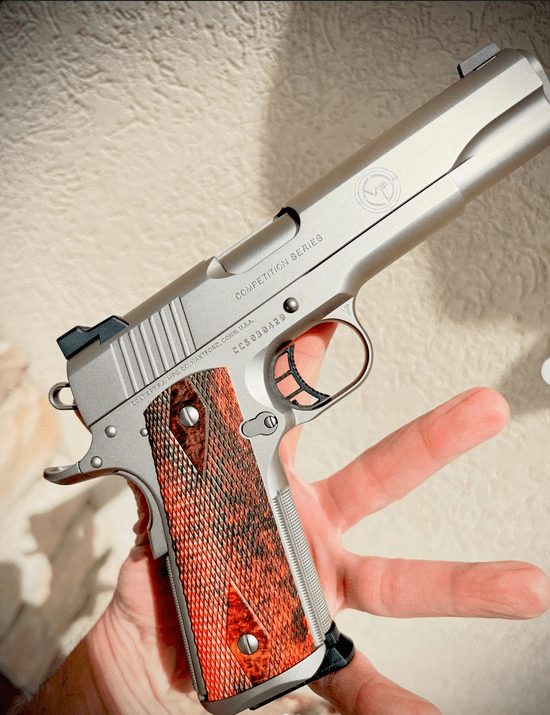 I had to walk outside to put this beautiful 1911 in the sun for you fellas. I bought this Colt, chambered in .45 ACP, from a cop buddy of mine. He had it built by Marine Corp veteran Nick Wasley (Valor Precision) out of Montville Ohio. It started life as a “budget build” so I sent it back to Nick and said finish the gun. He checkered it, changed the sights, did some accuracy work, and added some personal touches that I like…and now it’s my gun. Wasley, who was a Precision Weapons Technician in Quantico Virginia, specializes in crafting the legendary USMC MEU(SOC) —sidearms made for men who clear buildings in Afghanistan. Special thanks to Marty Enloe who coated this gun in bulletproof NP3, Jon Aho who hand checkered these beautiful double diamond grips, Karl Beining who graciously gifted me this STI trigger, and Bert Edmonston who lent this slide his endless talent. It takes a village