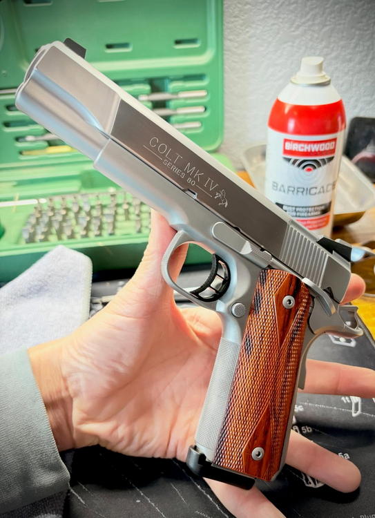 Approximately 18 months ago I found this stainless 80 series on the internet. It was made by Tempe AZ gunsmith Daniel Mullins, AKA “GlockMonger” –his handle on multiple shooting forums. I’m not exactly sure why, but it just kinda spoke to me. I didn’t know a single thing about the man, but I gathered from his online posts (and unfortunate obituary tributes) that he was a sardonically funny, bombastic dickhead, who was highly talented and dearly loved by his loyal customer base. So here it is, a seemingly nothing 1911 made by a virtual nobody. BUT to me, it stands firmly on business –riding on piano wire (read Accurails), with gorgeous carry cuts, hand checkered front strap and trigger guard, and an expertly blended beavertail, all capably assembled. The STI trigger was fit by an elderly doctor in his garage…because the heart wants what the heart wants. Is it a high-end 1911? No it is not. So why does it get Spegel grips? Because the man died at 46. So this gun, shod in these grips, with this post, are dedicated to his memory.
