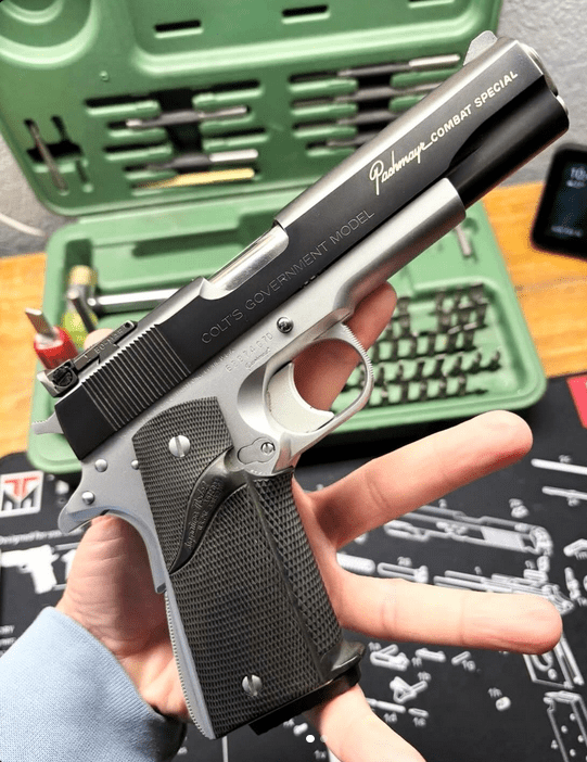 In the early 1930s, Frank Pachmayr left his father’s rifle business and opened his own shop. It didn’t take long for him to become interested in accurizing 1911s for bullseye shooting. Frank poured all of his time and effort into refining accuracy, ultimately focusing on what became known as the Signature System. Standard Pachmayr bullseye pistols were guaranteed to shoot 3-inch groups at 50 yards—impressive for the era—but Frank pushed for something more ambitious from the Signature. To achieve this, the Signature incorporated a complex system: a nosepiece with a Messerschmitt-style barrel ring and a slide-tightening yoke that wrapped up and around the receiver in front of the trigger guard. In theory, it should have worked. In practice, however, it created a frustrating paradox. Tightening the system improved accuracy but caused drag on the slide, compromising reliability. Loosening it restored reliability—but at the expense of accuracy. Enter Tom Dornaus, yes the Bren Ten guy. Originally hired to repair Signature models Dornaus quietly developed a different approach. On his own time, and without Frank’s knowledge, he built a prototype 1911 capable of shooting 1 inch groups, without all the complicated Signature bullshit. That pistol became the legendary Combat Special and the rest is history. The Combat Special was more reliable and delivered outstanding accuracy—everything shooters actually wanted. Frank, understandably, was disquieted by all of it. After years of investment in the Signature system, the market had spoken. When Ray Chapman chose a Combat Special as his prize for winning the first IPSC Championship, it underscored the shift for good. Most PCS were built by Craig Wetstein, with assistance from Mike LaRocca. When Wetstein left to open his own shop, Paul Liebenberg stepped in to complete the remaining production run. From 1974 to 1984, approximately 250 Combat Specials were produced (per LaRocca), though some estimate the true number may be higher. Regardless of the exact figure, these pistols earned their name—they are special. Demand reflected that reality, with wait times stretching beyond seven years. Here’s a relatively unfired one.