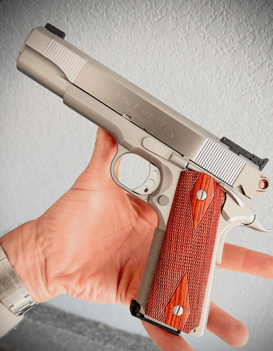 Colt stainless 80 series in .45 ACP by retired police lieutenant, master firearms instructor, and now CEO of TK Customs, Tom Kilhoffer out of Tomasboro Illinois. This 1911 is drum tight (with a low mounted Bomar and match grade Wilson barrel) and it runs like a scalded dog. Ordinarily, 80 series guns don’t deserve (or get) Spegels, but my well runneth deep as of late so why not. Cocobolo DDs by a dude with talent on loan from god.