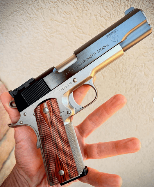 1977 “Large Letter” Colt 70 series by Marty Enloe. Marty was hired by industry legend Robbie Barrkman to focus on custom pistols at the now defunct Robar. Barrkman, who was trained by Gale McMillin, was focused on custom rifles so he needed a right hand man to build everything that wasn’t a rifle or a Glock. Enloe was that guy, building most of the special projects or guns that were to adorn the many magazine covers awarded to Robar over the years. The training at Robar was sparse. As stated before, Robbie was busy doing “other things” so a young gunsmith there had to be self motivated, and to a degree, self taught. Bill Laugheridge came through for a few days here and there to show the young bucks a thing or two, but for the most part you were on your own. Robar was known for stippling 1911 front straps, but checkering is life. Left to learn it on his own, Marty did what any smart man would do –he asked a guy down the street, who also happened to be the best in the business, to teach him…Mr. Ted Yost. Well you can see from this beautiful gun that Marty learned how to hand checker. Approximately one year ago, I sent Marty a crooked, out of spec Colt, and asked him to do the virtually impossible–turn it into this beautiful work of art. This gun, featuring hand checking, Kart match grade barrel, OG (low mount) Bomar sight, etc etc is simply exceptional. Of course the lower is NP3, which is effectively electroless nickel. The gun feels heavy and well balanced and it seems to inexplicably eat recoil. Add Enloe to the short list of gunsmiths that are willing to take on a Colt build. That list is shrinking by the day. This angel finally got its wings–double diamond grips by the venerable Mr. Spege