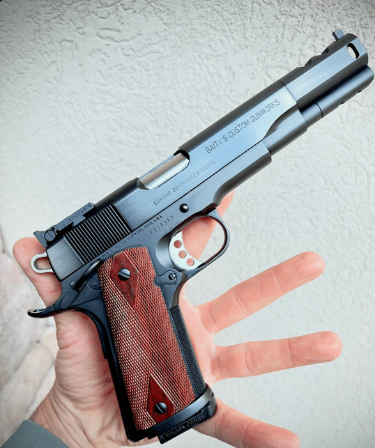 Leonard Baity out of North Wilkesboro NC was a cop who shot PPC in the foothills of the Blue Ridge Mountains. Baity’s foray into gunsmithing was born out of dashed dreams and broken promises —he and a fellow cop ordered a pair of guns from a local smith and got tired of waiting. Well like many competitive shooters (with the aptitude to do so) he took the bull by the horns and started making his own guns. He started building guns in a local workshop after work, but it wasn’t unusual for him to work until two in the morning. This put a strain on his marriage, so he left the police force and started gunsmithing full-time in the basement of a local gun store in North Wilkesboro. That shop would become a Mecca for local practical shooters. His work, as judged by this compensated commander, is simply exceptional. This is a grown up 1911 and an unusual one to find in the wild. You may ask why build a compensated 1911 on a commander slide? Why are Porsche 911s smaller than pickup trucks? Because smaller (read lighter) things generally move at a faster velocity. Grips by Hogue because I can’t bring myself to cut up a set of Spegels for this gun.