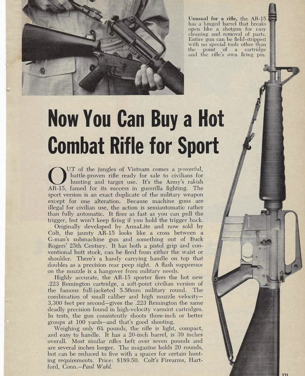 This is a one page article that appeared in the Feb. 1965 issue of Popular Science promoting the Colt AR-15 Sporter.