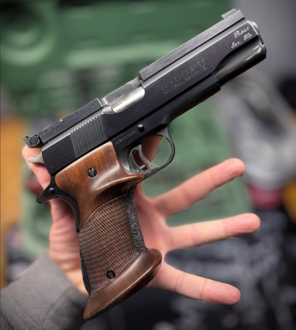 From 1911_purview Gold Cup National Match in .45 ACP by bullseye shooter and retired highway patrolman, Jimmy Gale Rose out of Jacksonville, Fl. For decades Jimmy made BE guns for hundreds of accomplished shooters in the southeast. He passed away in 201. Custom grips by Steve Herrett